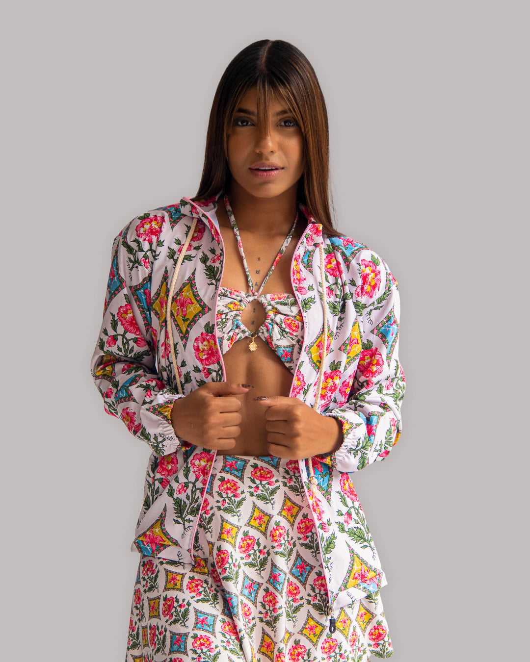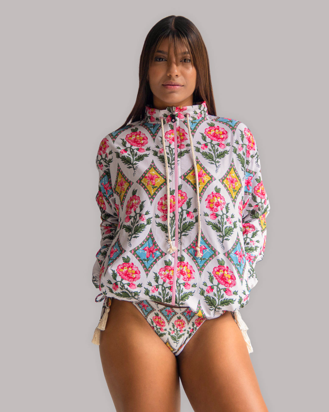 Diseño con cierre frontal, bolsillos laterales y el estampado exclusivo de la colección Bendita Rosa, que combina tonos cálidos y motivos tropicales.