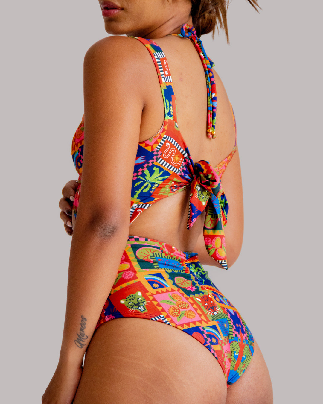 Un enterizo moderno, estilizado y súper favorecedor. Su escote halter con amarre ajustable realza el busto, mientras que el corte cut out define la cintura y crea un efecto reloj de arena inmediato. La espalda con lazo permite ajustar el fit a tu medida, ofreciendo comodidad y soporte. El estampado Tropical Mocha aporta un look vibrante, único y lleno de personalidad — perfecto para sentirte segura y espectacular en playa o piscina.