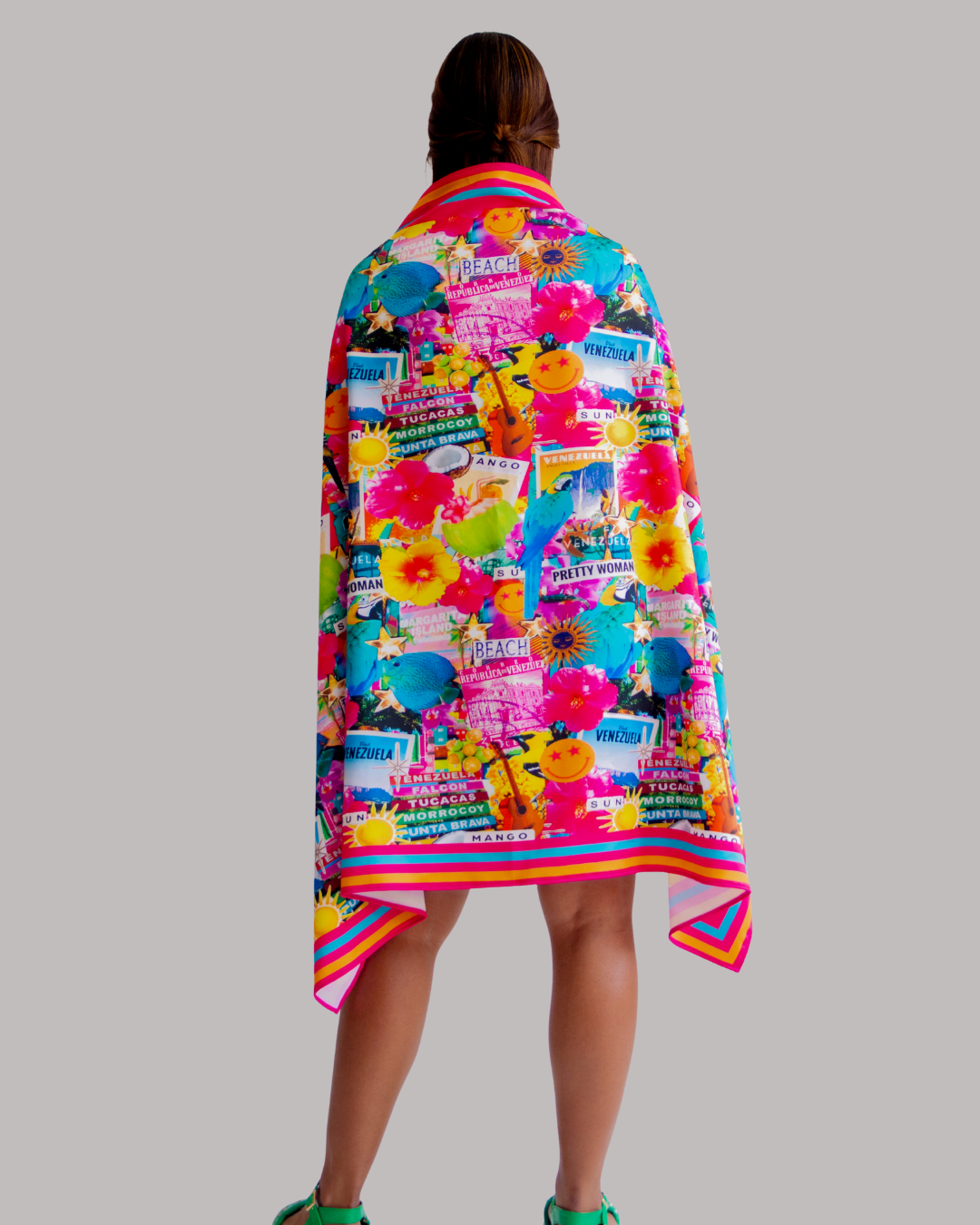 Pareo en crepé de seda con caída suave, elegante y fluida. Su textura fresca y delicada lo hace perfecto para usar como salida de playa, falda ligera o complemento chic sobre cualquier bikini Venezolana. El estampado exclusivo llena el look de color y movimiento, realzando la figura con un toque sofisticado.
