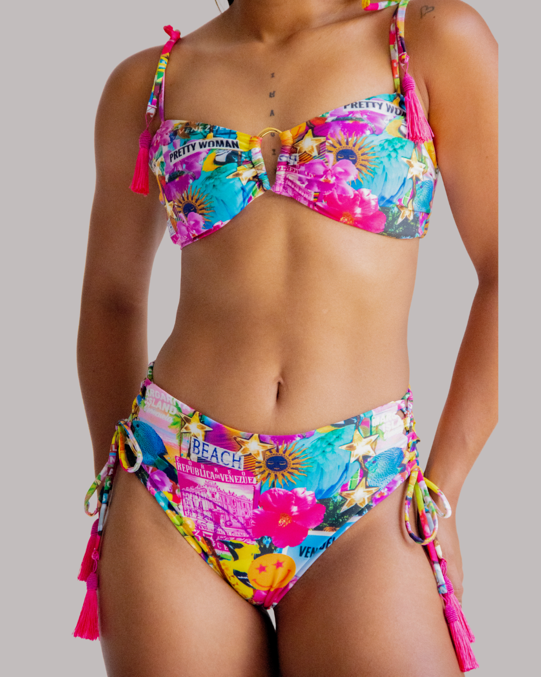 Set clásico y favorecedor que realza tu figura con un top de aro central, cargado de soporte y un toque femenino, acompañado de una panty con ojales laterales que se adapta al cuerpo sin marcar. Su estampado Venezolana hace que cada pieza destaque por su vibra alegre y caribeña. Cómodo, estilizado y perfecto para resaltar en la playa o la piscina.